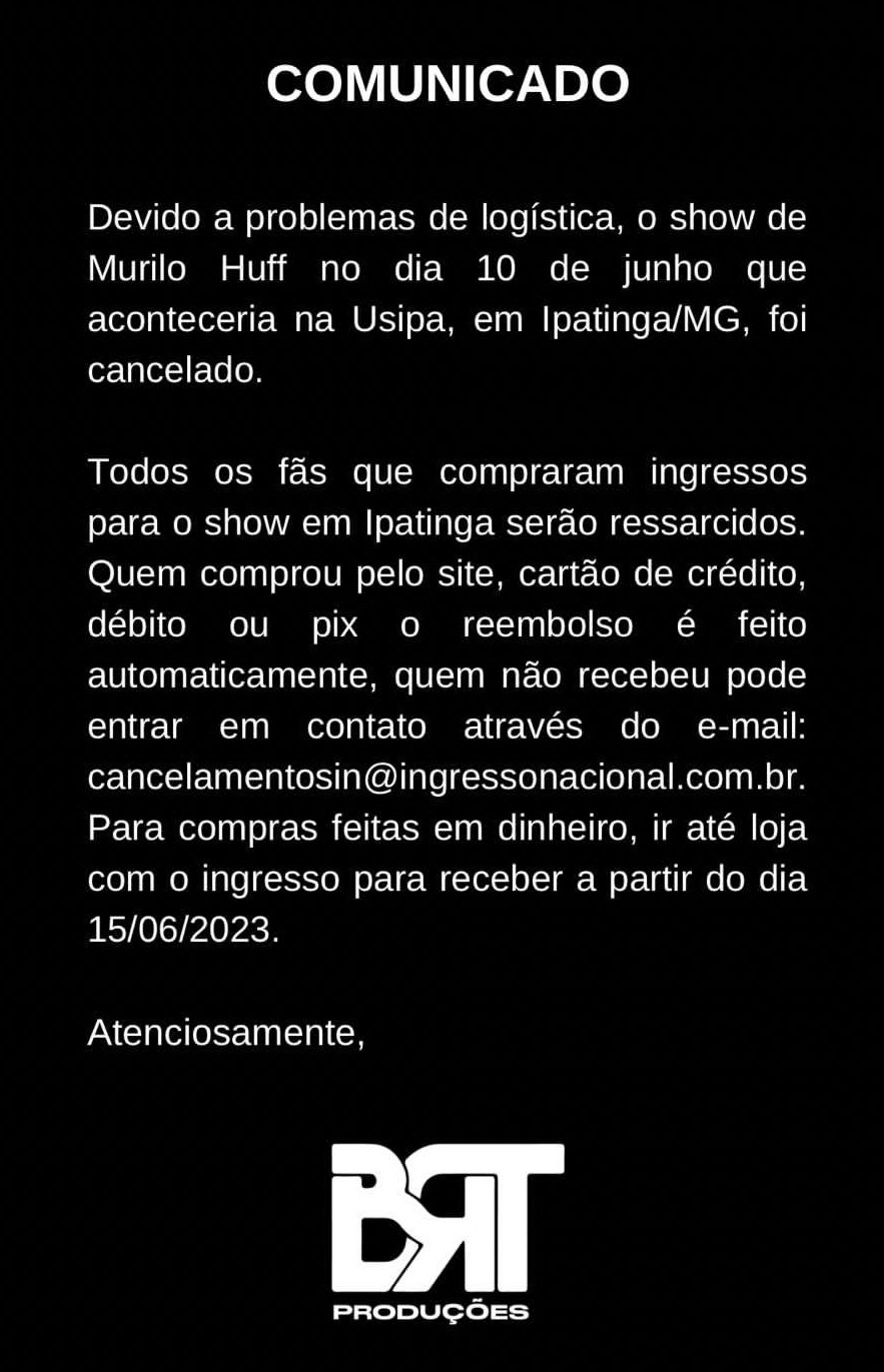 O show do cantor sertanejo Murilo Huff, que aconteceria neste sábado (10) na Usipa, em Ipatinga, no Vale do Aço, foi cancelado pela produtora do evento. Através de uma nota oficial, a empresa informou que o evento não irá ocorrer “devido a problemas de logística”.