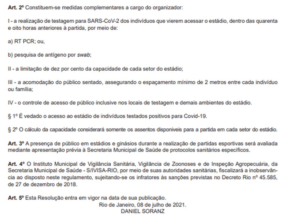 “A gente teve a final da Copa Libertadores, liberamos para que tivesse 5 mil convidados. Eles concentraram todos em um só setor do Maracanã, o que foi um problema, a Prefeitura multou. A mudança é essa: 10% de cada setor do estádio, com um espaçamento grande entre as pessoas. São todos convidados da Conmebol e serão testados”, disse Eduardo Paes, prefeito do Rio de Janeiro.
