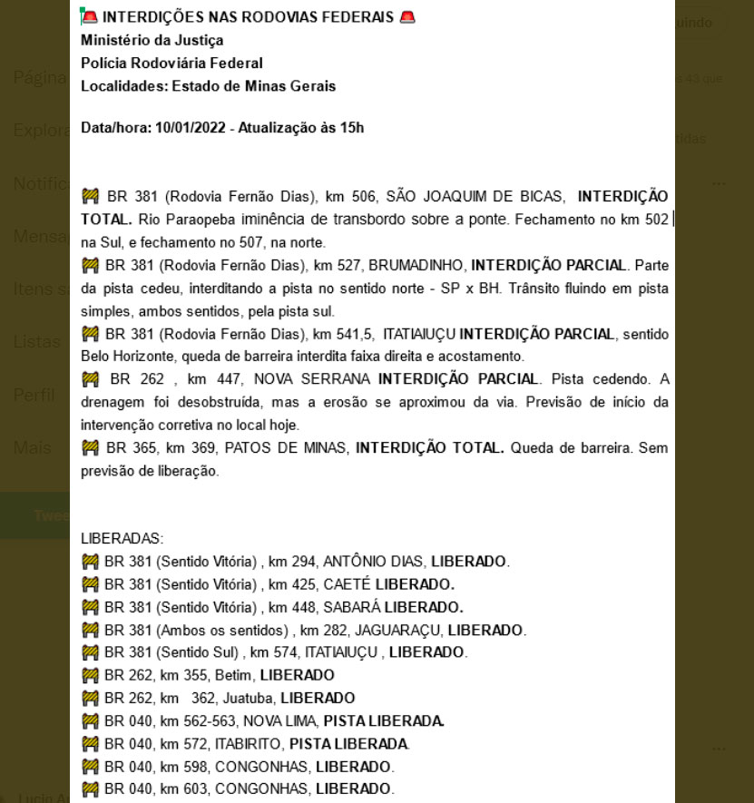 Veja o alerta, publicado pela PRF de Minas Gerais no Twitter.