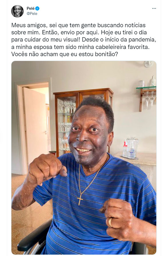 Meus amigos, sei que tem gente buscando notícias sobre mim. Então, envio por aqui. Hoje eu tirei o dia para cuidar do meu visual! Desde o início da pandemia, a minha esposa tem sido minha cabeleireira favorita. Vocês não acham que eu estou bonitão? pic.twitter.com/obrA8SM3d0— Pelé (@Pele) February 10, 2022