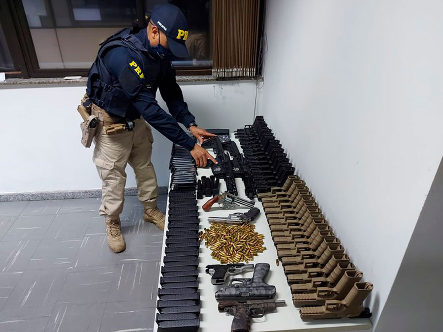 Segundo a PRF, foram apreendidas 35 pistolas semiautomáticas de vários calibres, dois revólveres (calibres 357 e calibre 38) e dois fuzis calibre 556, totalizando 39 armas. Além disso, a PRF ainda apreendeu 213 munições calibre 9mm e 68 carregadores para pistolas.