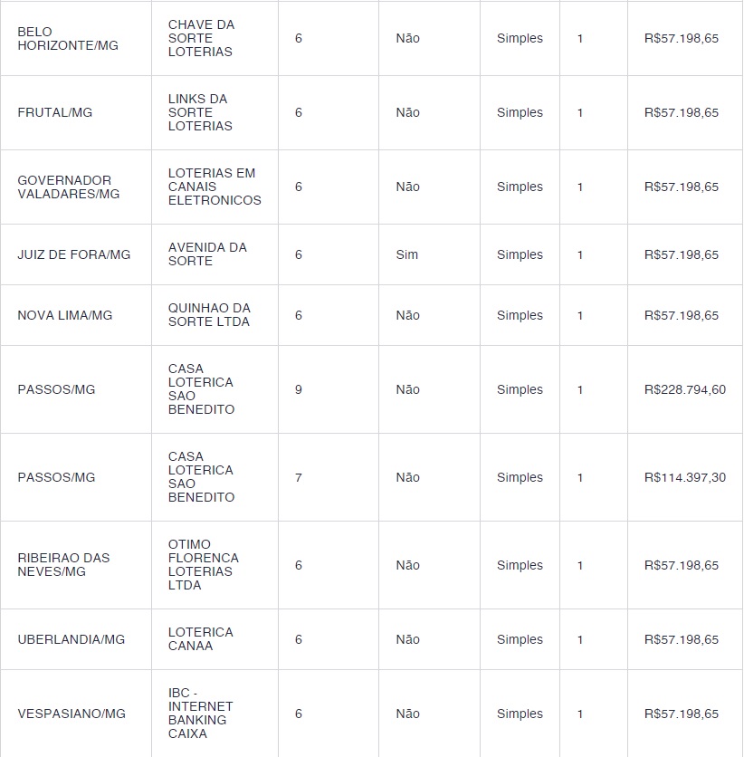 Dez apostas feitas em Minas Gerais foram contempladas na quina. Oito delas, nas cidades de Belo Horizonte, Frutal, Governador Valadares, Juiz de Fora, Nova Lima, Ribeirão das Neves, Uberlândia e Vespasiano receberão o prêmio de R$57.198,65. As outras duas, feitas no município de Passos, irão receber R$228.794,60 e R$114.397,30.