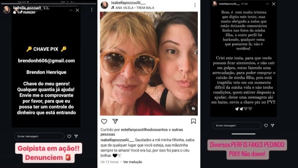 Um dos perfis fraudulentos se faz passar por um familiar de Isabella e pede dinheiro para a compra de um caixão. Outro perfil, ainda mais audacioso, finge ser a mãe da jovem, postando uma foto das duas acompanhada de uma mensagem emocional: “Saudades a mil minha filha, saiba que de qualquer lugar que você esteja, sua mãezinha sempre te amará! Você era luz, por isso foi para o céu brilhar.”