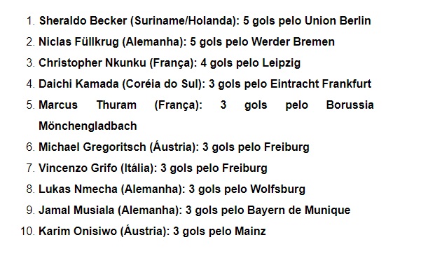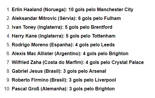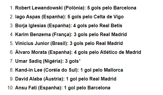 Já na principal liga espanhola há apenas um brasileiro entre os 10 principais artilheiros - Vinicius Junior, que aparece em 5° lugar com 3 gols pelo Real Madrid.