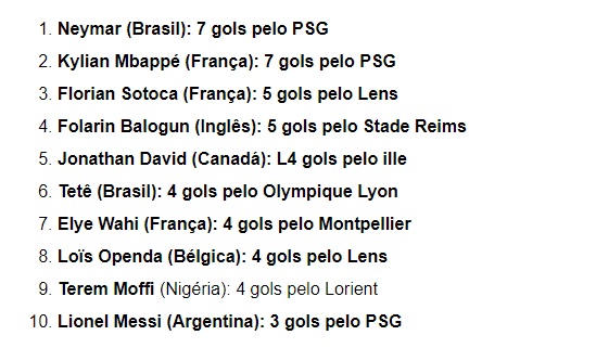 Na principal liga francesa, os brasileiros são representados entre os principais artilheiros com Neymar, atualmente em 1° lugar com 7 gols pelo PSG, e por Tetê, em 6°, com 4 gols pelo Olympique Lyon.