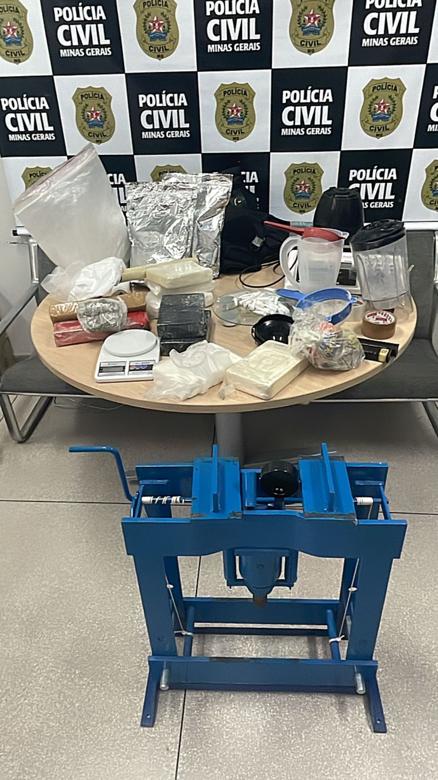 Cientes de que no aglomerado havia algumas moradias que o suspeito utilizava para a guarda e processamento dos entorpecentes, policiais civis foram até o local, onde apreenderam diversos materiais ilícitos, entre eles sete barras, 45 pinos e dois pedaços de barras de cocaína; duas barras de maconha e um pedaço de barra da mesma droga; dois sacos transparentes de substância esbranquiçada; três balanças digitais; uma prensa hidráulica; uma máquina de embalar a vácuo; um liquidificador; duas peneiras; dois carregadores de arma; quatro munições calibre 38; três capas de coletes balísticos; e três agendas com anotações sobre o tráfico de drogas.
