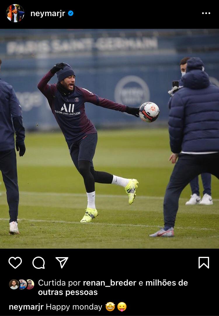 O PSG é o vice-líder do Campeonato Francês, com 39 pontos, a apenas um de alcançar o Lyon, primeiro colocado, com 40 pontos. Pelo Instagram, Neymar também postou uma foto com a mensagem "segunda-feira feliz". Foi o primeiro treino dele sob o comando do novo técnico Mauricio Pochetthino.