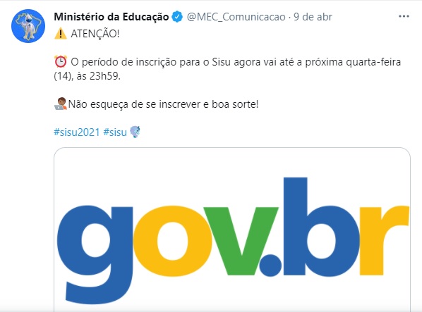 O Ministério da Educação (MEC) prorrogou o prazo de inscrição para o Sistema de Seleção Unificada (Sisu) para o dia 14 de abril, às 23h59. Inicialmente, o prazo se encerrava hoje (9). O anúncio da prorrogação foi feito na noite desta sexta-feira pelo ministério.