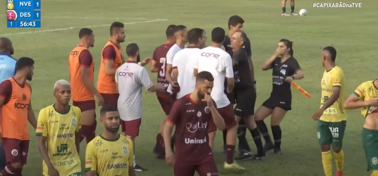 A Desportiva Ferroviária foi eliminada do Estadual, após derrota ontem (10) por 3 a 1 para a Nova Venécia, que avançou às semifinais. A agressão à Macielly Netto ocorreu no intervalo, após Rafael Soriano ter sido punido com um cartão amarelo. Após deferir a cabeçada na bandeirinha, o técnico foi expulso da partida.