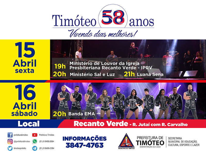 A festa em comemoração aos 58 anos de Timóteo tem sequência no próximo fim de semana, nos dias 15 e 16 de abril. As atrações musicais estão programadas para o Recanto Verde, entre as Ruas Jutaí e Carvalho. Na sexta-feira, dia 15, a programação começa às 19h com a apresentação dos grupos de música gospel Ministério de Louvor da Igreja Presbiteriana do Recanto Verde, Ministério Sal e Luz, e Luana Sena. No sábado (16), a partir das 20h, a animação fica por conta da Banda EMA trazendo um repertório com músicas nacional e internacional.