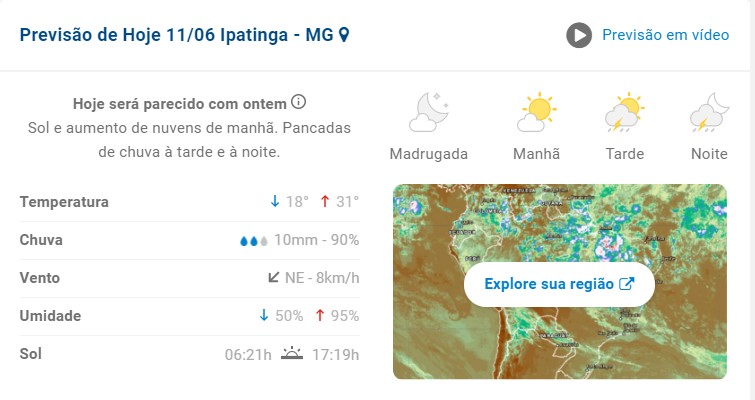 Ainda segundo o site, Ipatinga poderia ter 95% de umidade do ar. Desde a manhã, o tempo estava ensolarado e não aparentando riscos de chuva na região.