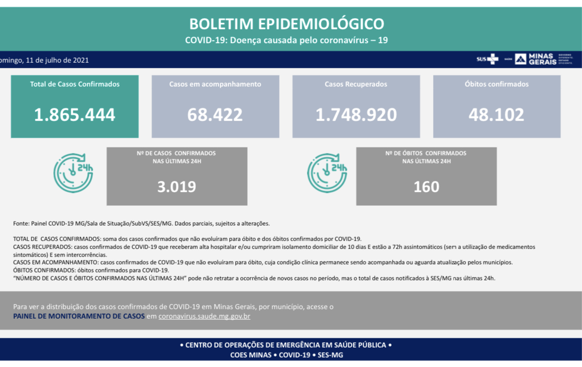 O estado registra o número total de 1.865.444 casos desde o início da pandemia. Com os novos óbitos, Minas contabiliza 48.102 vidas perdidas para o vírus. Do número total de infectados, 1.748.920 já foram considerados recuperados.
