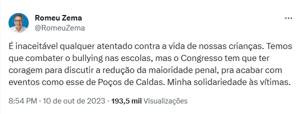 É inaceitável qualquer atentado contra a vida de nossas crianças. Temos que combater o bullying nas escolas, mas o Congresso tem que ter coragem para discutir a redução da maioridade penal, pra acabar com eventos como esse de Poços de Caldas. Minha solidariedade às vítimas… - Veja mais em https://noticias.uol.com.br/cotidiano/ultimas-noticias/2023/10/10/zema-repudia-ataque-em-escola-de-pocos-de-caldas.htm?cmpid=copiaecola