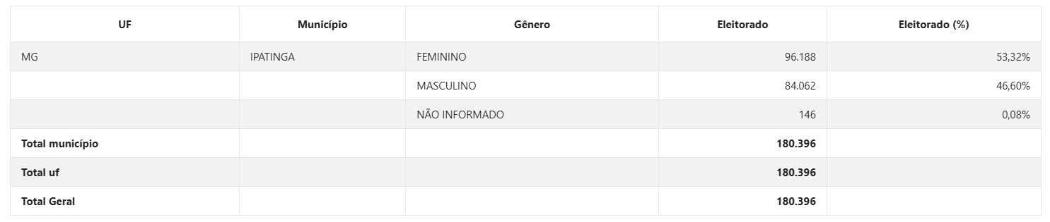 Em Ipatinga, são 180.396 eleitores. A maioria são mulheres: 96.188 (53,32%), enquanto há 84.062 (46,60%) homens aptos a votar. E 146 (0,08%) pessoas em que o gênero não foi informado, segundo o Tribunal Superior Eleitoral (TRE-MG).