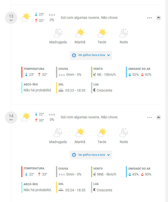 Já na quinta (13) e sexta-feira (14), a previsão é de tempo nublado e sem chuva, o que não acontecia há alguns dias na região. Com isso, as temperaturas devem subir, ficando entre a mínima de 22ºC e a máxima de 33Cº. Veja a previsão para quinta e sexta: