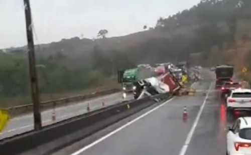 Acidente na BR-381 em Minas Gerais causa derramamento de 50 toneladas de garrafas de bebidas sobre a pista, sem feridos