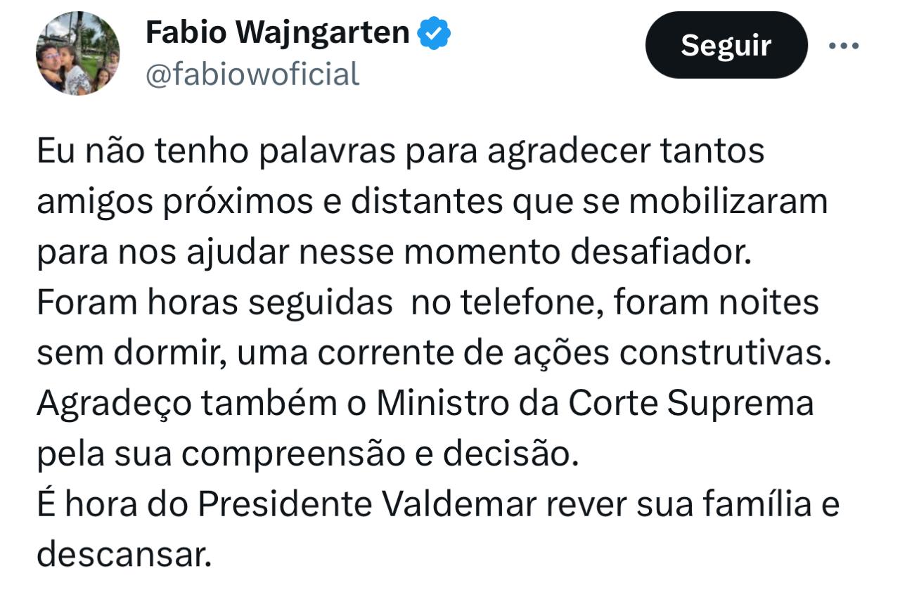 O advogado Fabio Wajngarten, que representa a defesa do ex-presidente Jair Bolsonaro, escreveu sobre a decisão nas redes sociais. “O presidente [nacional do PL] Valdemar acaba de ser solto decorrente de decisão do Ministro Alexandre de Moraes. Teve concedida a sua liberdade provisória”, postou Wajngarten na rede social X (antigo Twitter).