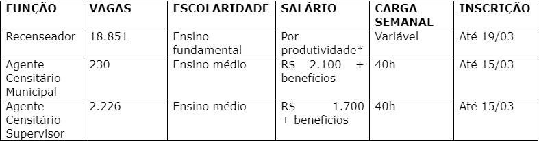 As inscrições para ACM e ACS vão até 15 de março. Já para recenseador, as inscrições serão realizadas até 19 de março.