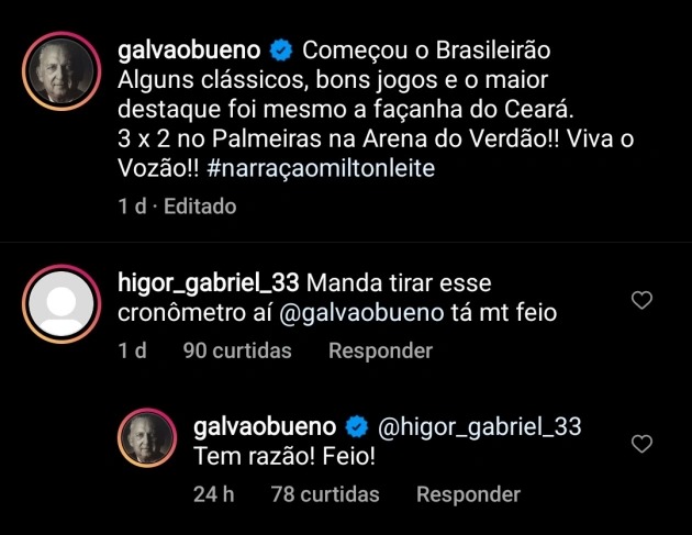 Até mesmo o principal narrador da Globo, Galvão Bueno, não agradou da novidade. Ele respondeu um seguidor no Instagram dizendo que achou feio.