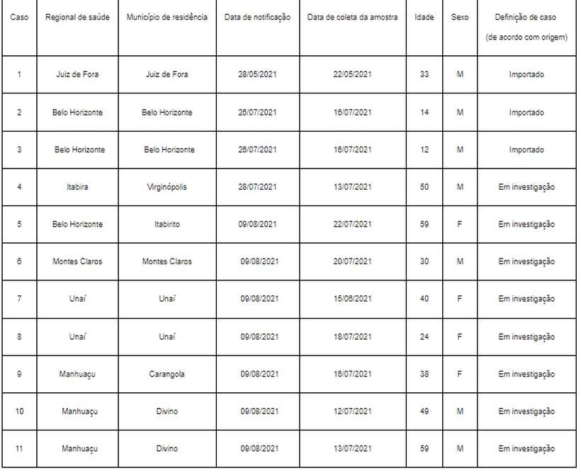 Nessa quarta-feira (11), a Secretaria de Estado de Saúde de Minas Gerais (SES-MG) divulgou que notificou 11 casos confirmados da variante Delta no estado. A pasta informou que com o apoio do municípios, os casos seguem em investigação para avaliação do histórico dos pacientes e seus contatos. Por conta disso, não é possível afirmar que no território mineiro já haja transmissão comunitária da variante.