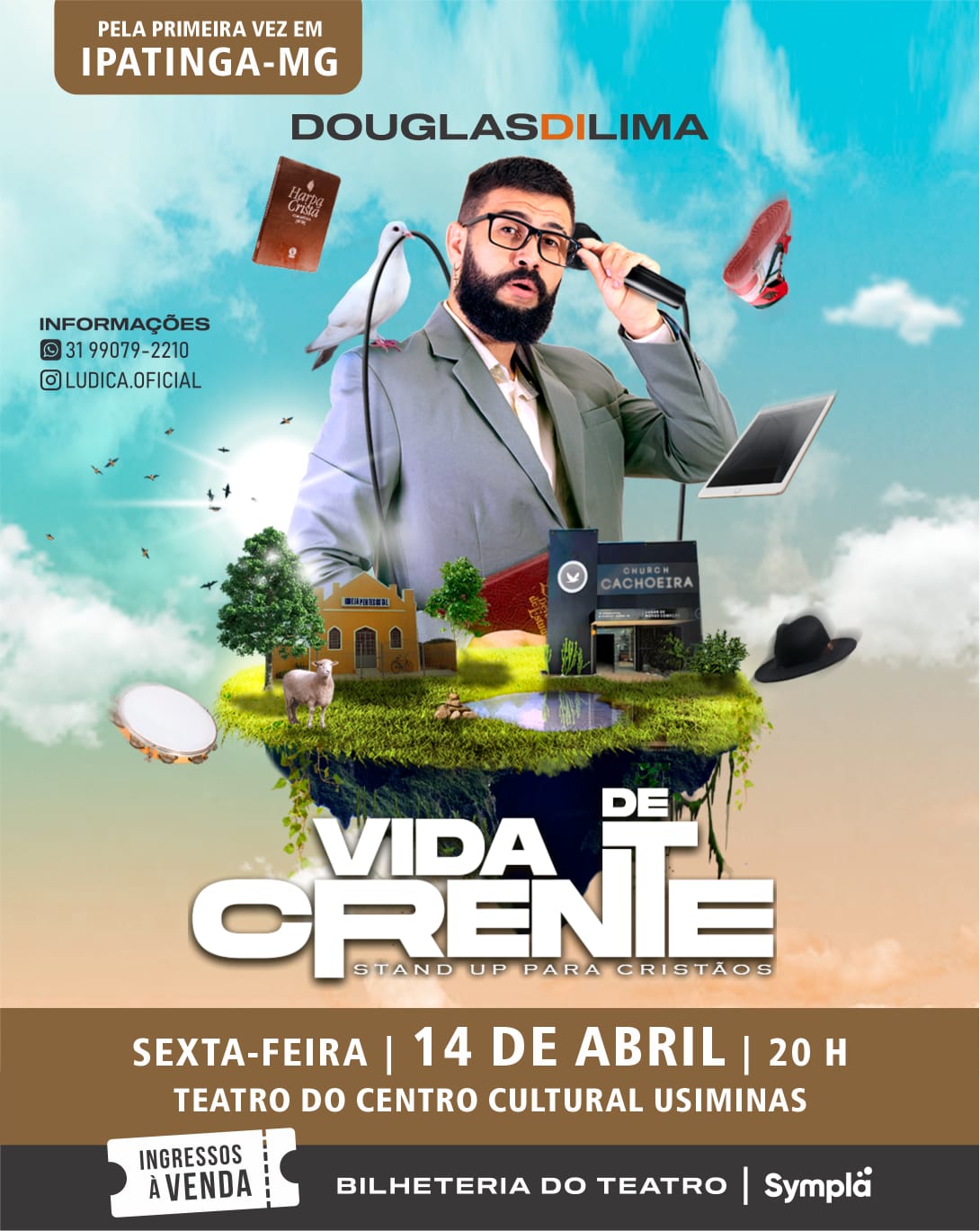 Nesta sexta-feira, 14 de abril, o Teatro do Centro Cultural Usiminas, em Ipatinga, será palco da comédia Stand-Up Gospel "Vida de Crente", às 20 horas. O espetáculo, protagonizado pelo comediante Douglas Di Lima, aborda o cotidiano dos cristãos de maneira bem-humorada, tanto dentro quanto fora da igreja.