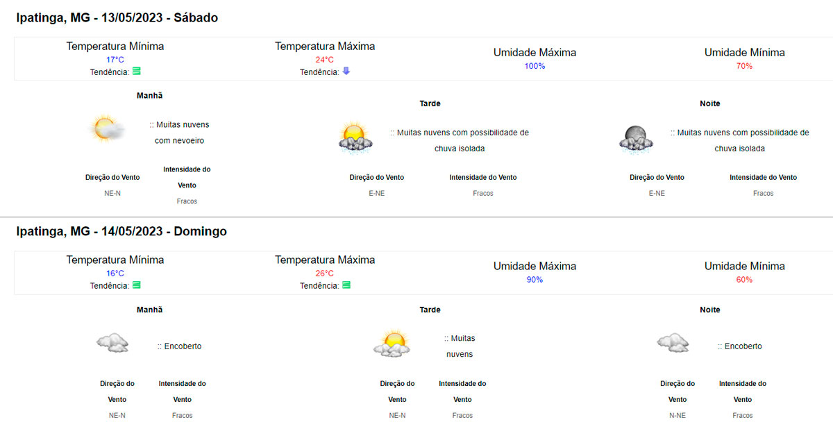 Segundo informações do Instituto Nacional de Meteorologia (Inmet), se baseando pela cidade de Ipatinga, principal cidade do Vale do Aço, este sábado será um dia instável. A temperatura mínima prevista é de 17°C e a máxima de 24°C, com uma leve tendência de declínio. A umidade varia entre 100% e 70% ao longo do dia.