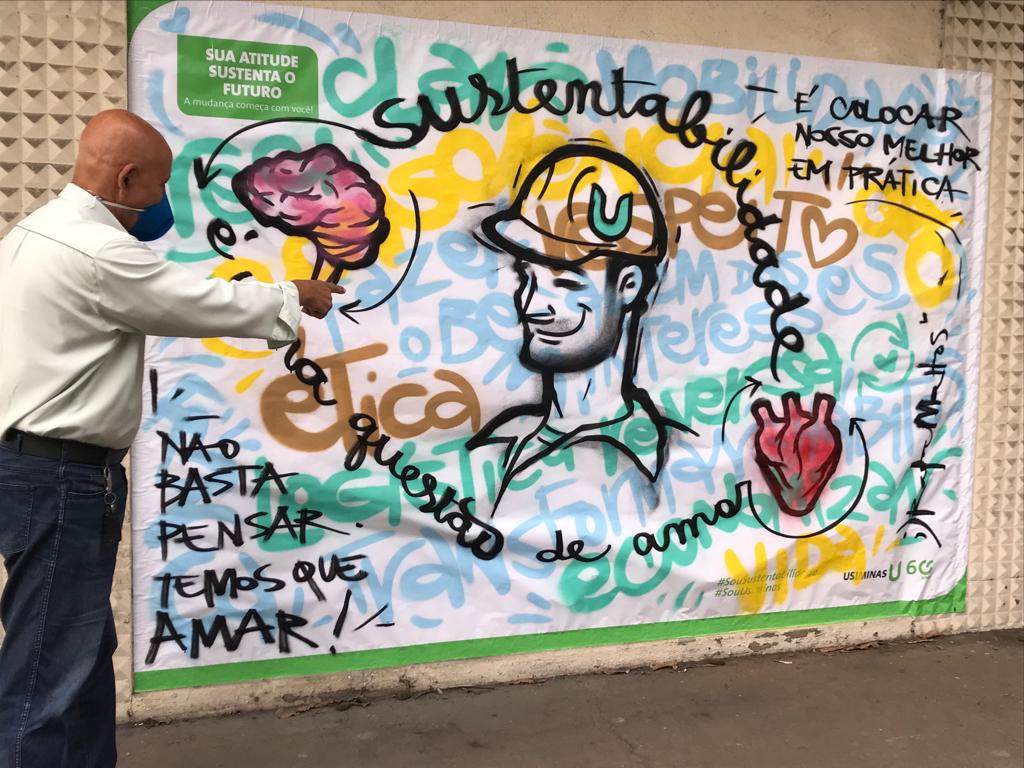 A Usiminas, em comemoração ao mês do meio ambiente, convidou o artista plástico Rafael Mattos, do projeto “Plante Amor, Colha o Bem”, para criar um painel artístico na portaria 3 da Usina de Ipatinga, na última sexta-feira, dia 10.