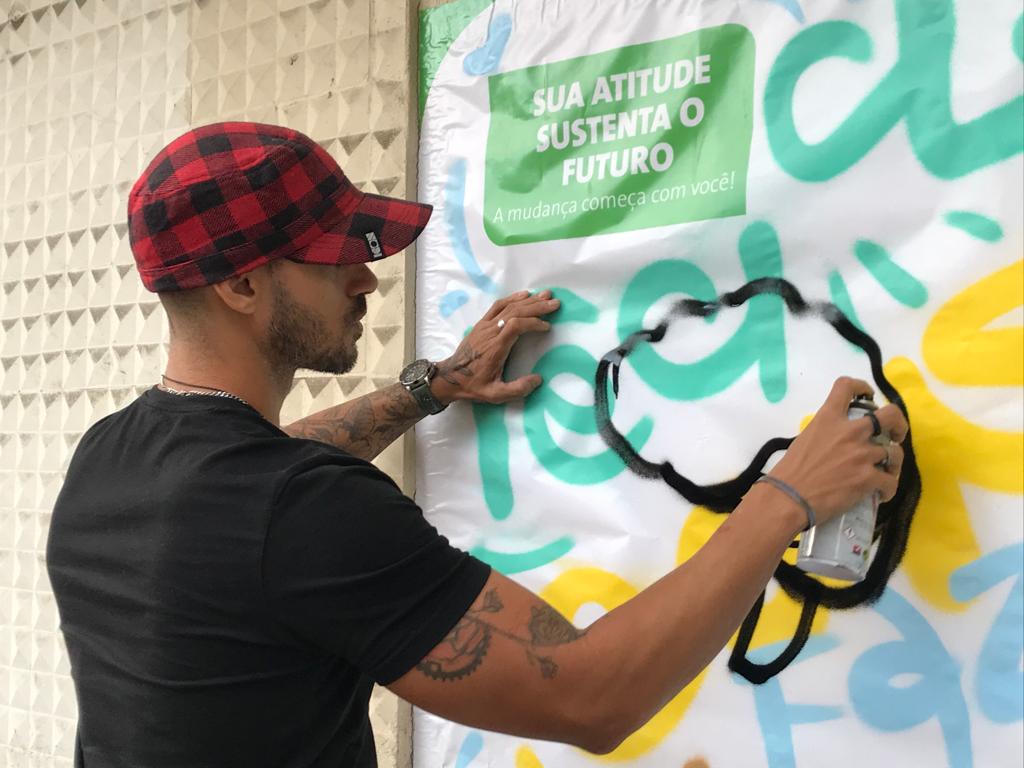 Na medida em que os colaboradores iam chegando ao local, o artista perguntava sobre quais mensagens importantes gostariam de ressaltar, sobre o meio ambiente, para registrar na obra. Com desenhos gráficos, criados “ao vivo”, o painel exibe mensagens sobre a importância de atitudes sustentáveis para um futuro melhor.
