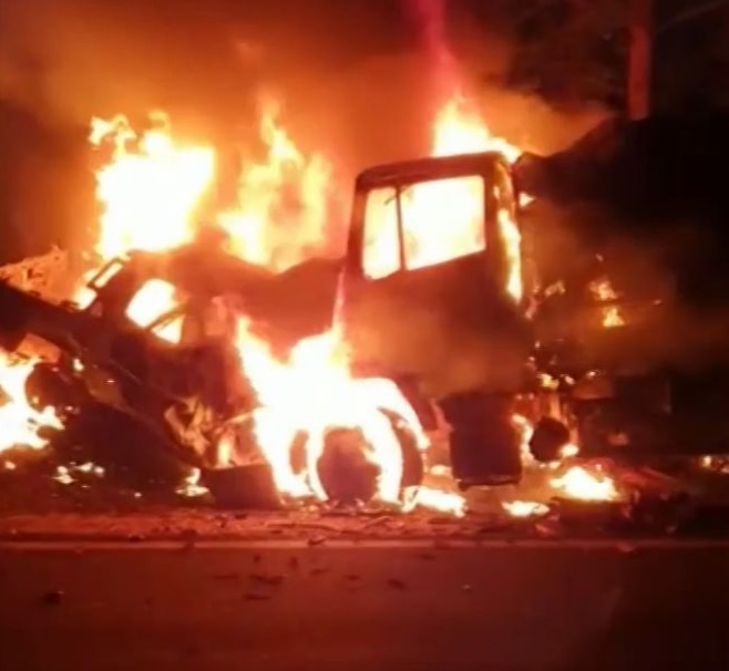 O Corpo de Bombeiros foi acionado. A caminhonete foi consumida pelas chamas. Já o caminhão, teve a cabine atingida pelo fogo.