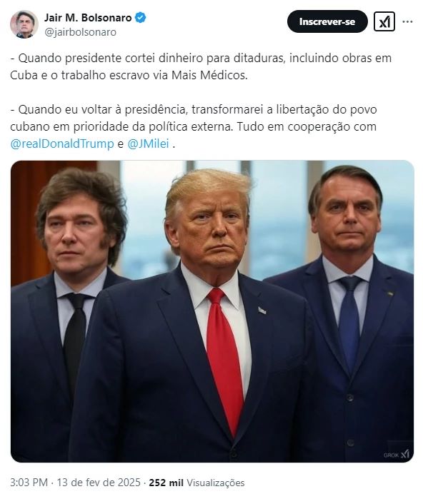 “Quando presidente, cortei dinheiro para ditaduras, incluindo obras em Cuba e o trabalho escravo via Mais Médicos. Quando eu voltar à presidência, transformarei a libertação do povo cubano em prioridade da política externa. Tudo em cooperação com Donald Trump e Javier Milei”, escreveu.