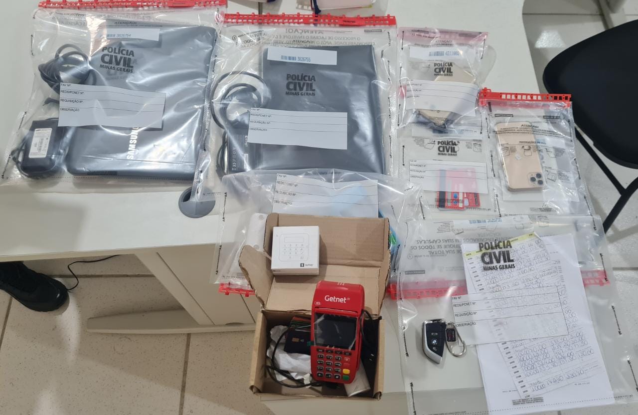 Durante o cumprimento de buscas foram apreendidos notebooks, aparelhos celulares, máquinas de cartão, um pendrive, cartões bancários em nome de terceiros, documentos bancários, um automóvel BMW X6.