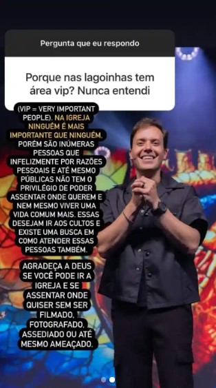 Valadão explicou que figuras públicas frequentemente enfrentam assédio e ameaças, e a separação visa permitir que essas pessoas participem dos cultos de forma segura. “Essas desejam ir aos cultos e existe uma busca em como atender essas pessoas também”, lembrou o pastor.