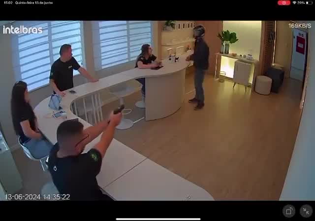 Imagens capturadas pelas câmeras de segurança mostram o assaltante entrando na loja armado com uma pistola e anunciando o assalto. O proprietário, que estava sentado atrás de um balcão, reagiu rapidamente, disparando cinco vezes contra o criminoso.