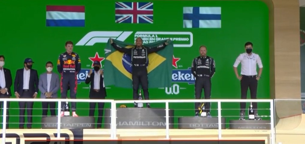 Aos gritos de "Senna", o heptacampeão desfilou após a bandeirada da ginasta Rebeca Andrade com a bandeira do Brasil nas mãos. Hamilton fez alusão ao gesto do ídolo brasileiro Ayrton Senna, tricampeão na Fórmula 1.