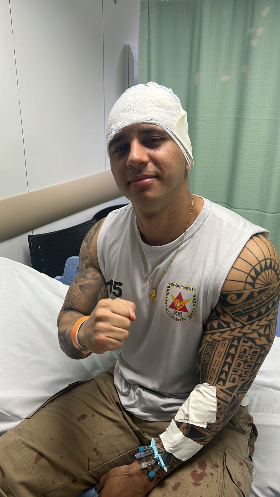 O PLOX apurou junto a Polícia Militar que se trata do Sargento Moraes. Ele foi prontamente socorrido e encaminhado ao Hospital Márcio Cunha. Apesar de ter sido atingido por um tiro na cabeça, exames preliminares apontam que o militar não corre risco. “Senhores, sargento Morais está bem, não corre risco nenhum de vida. Está conversando e levou 8 pontos na cabeça, disparo de raspão”, afirma mensagem a qual o PLOX teve acesso.