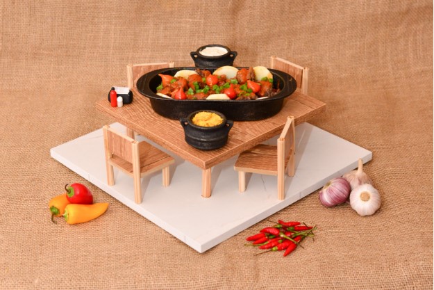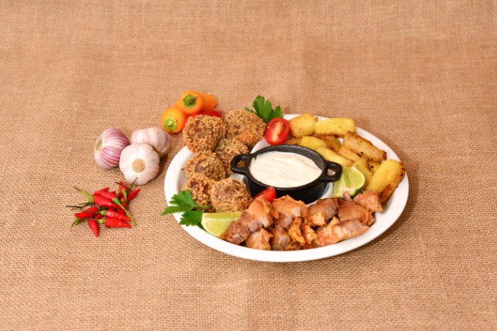Picanha suína na fumaça com palmito e queijo regado com fraldinha bovina ao molho, farofa de banana da terra e creme de especiarias.