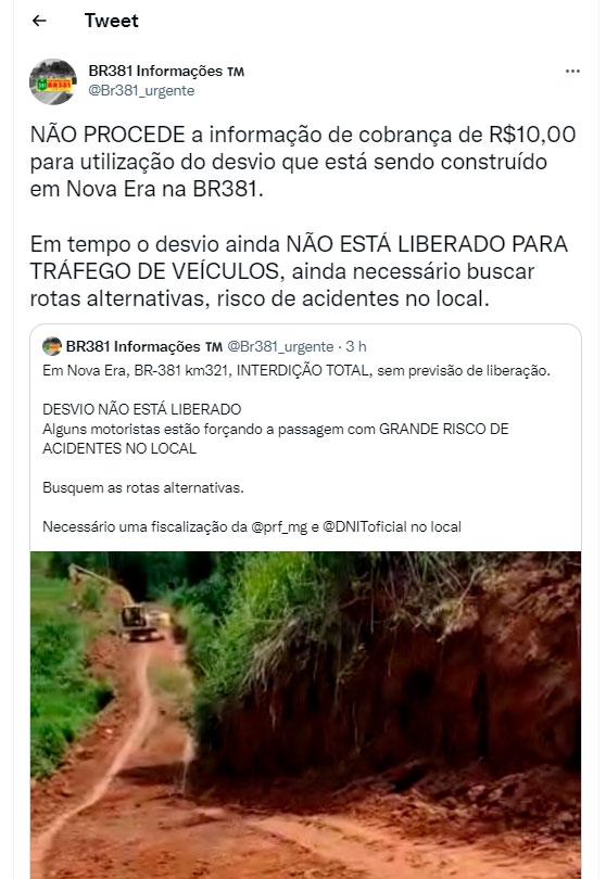NÃO PROCEDE a informação de cobrança de R$10,00 para utilização do desvio que está sendo construído em Nova Era na BR381. Em tempo o desvio ainda NÃO ESTÁ LIBERADO PARA TRÁFEGO DE VEÍCULOS, ainda necessário buscar rotas alternativas, risco de acidentes no local. https://t.co/TEMAhl6oms— BR381 Informações ™️ (@Br381_urgente) January 16, 2022