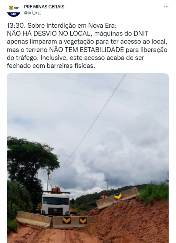13:30. Sobre interdição em Nova Era:NÃO HÁ DESVIO NO LOCAL, máquinas do DNIT apenas limparam a vegetação para ter acesso ao local, mas o terreno NÃO TEM ESTABILIDADE para liberação do tráfego. Inclusive, este acesso acaba de ser fechado com barreiras físicas. https://t.co/CYl7ZNqFcf pic.twitter.com/CFUoKt9V9w— PRF MINAS GERAIS (@prf_mg) January 16, 2022