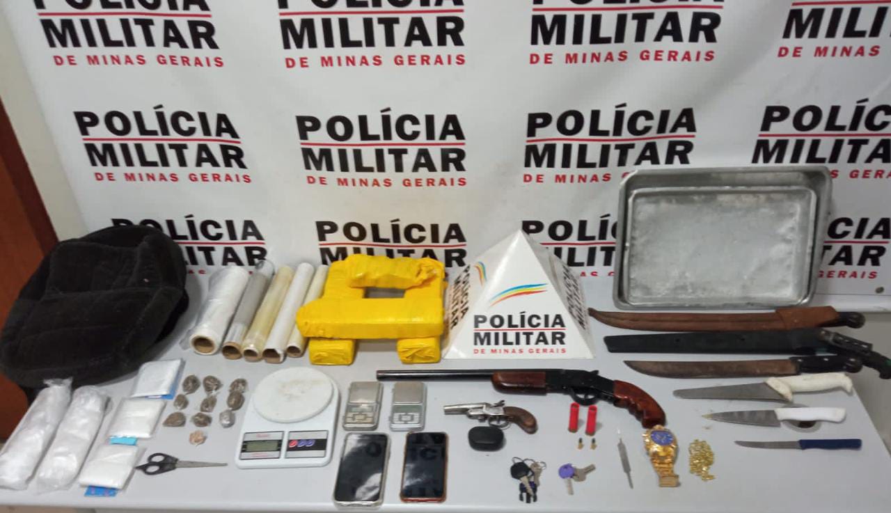 Ao todo, os policiais apreenderam: uma arma de fogo Rossi calibre .22; uma arma de fogo calibre .28; duas munições calibre .28; duas munições calibre .22; quatro barras e nove buchas de maconha; uma pedra de crack; três balanças de precisão; dois aparelhos celulares; seis facas/facões; uma tesoura; rolos de papel filme; um relógio e um cordão dourado.