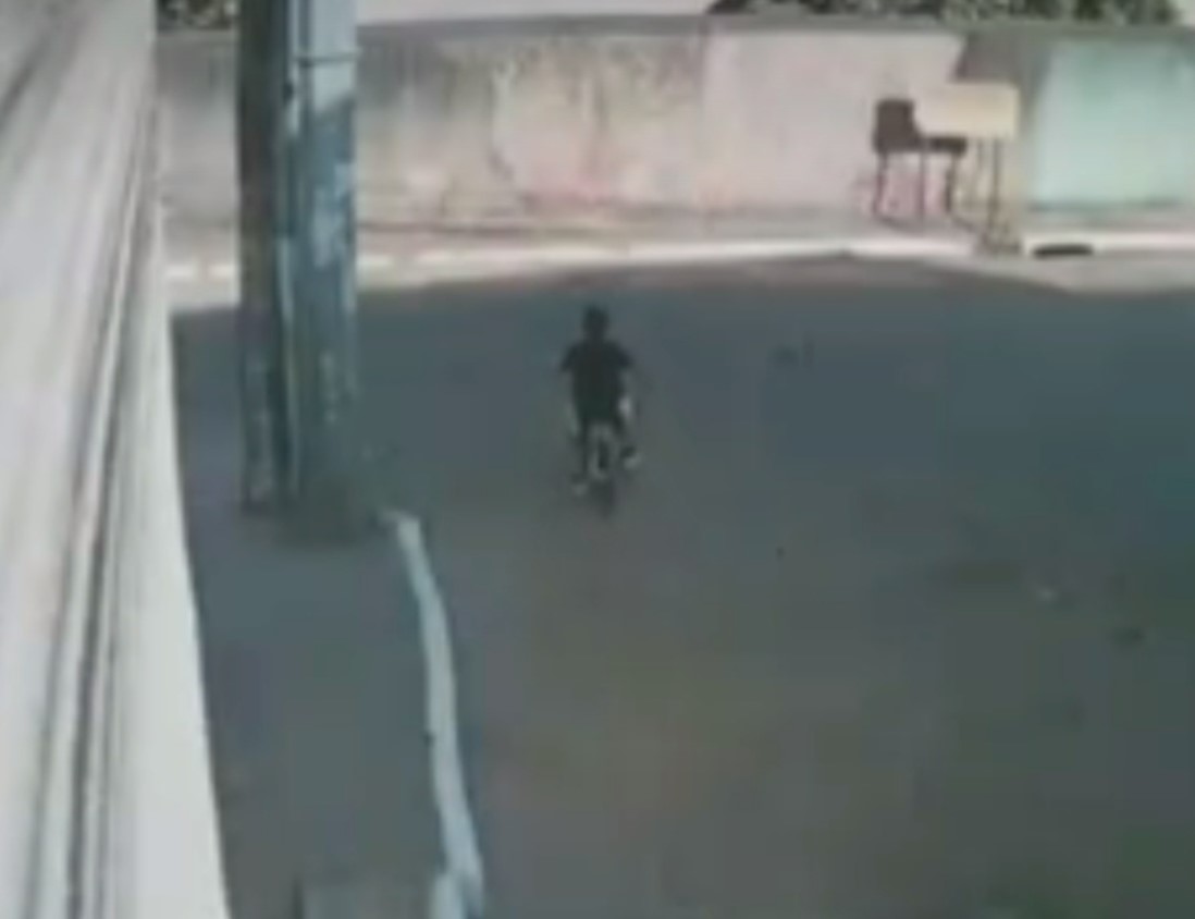 Imagens de câmeras de segurança flagraram o momento em que a criança desce o morro em uma bicicleta aparentemente sem freios e acaba batendo violentamente em um muro.