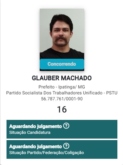 GLAUBER MACHADO vai concorrer pelo Partido Socialista Dos Trabalhadores Unificado - PSTU. Ele tem 29 anos e é natural de Ipatinga - MG. É a primeira vez que disputa eleição para prefeito de Ipatinga. O vice é Rair Anício, do PSTU.