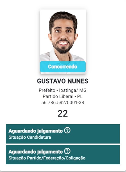 GUSTAVO NUNES vai concorrer pelo Partido Liberal - PL. Ele tem 30 anos e é natural de Ipatinga - MG. É o atual prefeito de Ipatinga. O vice é Pedrao Da Aapi, do Cidadania.
