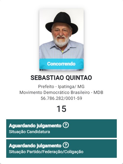 SEBASTIAO QUINTAO vai concorrer pelo Movimento Democrático Brasileiro - MDB. Ele tem 80 anos e é natural de Marliéria - MG. Já foi prefeito de Ipatinga. O vice é Dr Jesus Nascimento, do MDB.