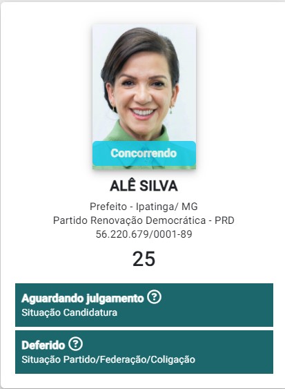 ALÊ SILVA vai concorrer pelo Partido Renovação Democrática - PRD. Ela tem 50 anos e é natural de Petrópolis - RJ. É a primeira vez que disputa eleição para prefeita de Ipatinga. Na carreira política, já foi deputada federal de 2019 a 2022. O vice é Dr Rogerio Leal Campos, do PRD.