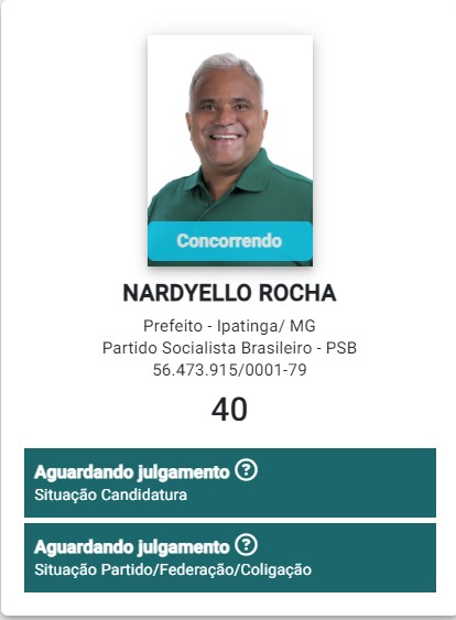 NARDYELLO ROCHA vai concorrer pelo Partido Socialista Brasileiro - PSB. Ele tem 58 anos e é natural de Ipatinga - MG. Já foi prefeito de Ipatinga. O vice é Dr Juliano, do PSB.