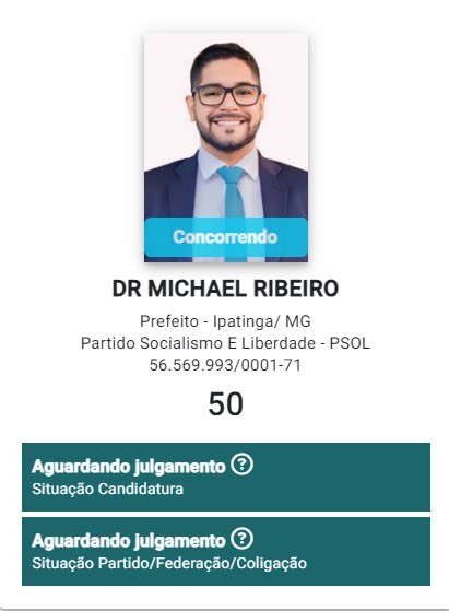 DR MICHAEL RIBEIRO vai concorrer pelo Partido Socialismo E Liberdade - PSOL. Ele tem 33 anos e é natural de Ipatinga - MG. É a primeira vez que disputa eleição para prefeito de Ipatinga. O vice é Rennan Vilar, do PSOL.