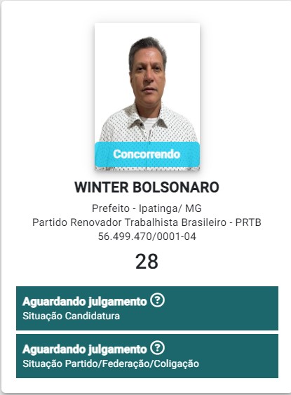 WINTER BOLSONARO vai concorrer pelo Partido Renovador Trabalhista Brasileiro - PRTB. Ele tem 53 anos e é natural de Ipatinga - MG. É a primeira vez que disputa eleição para prefeito de Ipatinga. O vice é Pastor Clinton, do PRTB.