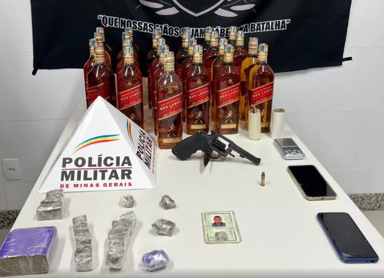 Na operação, foram encontrados um revólver calibre 38, um cartucho do mesmo calibre, uma barra e 22 porções de maconha, uma balança de precisão, dois celulares, R$ 200 em dinheiro e 25 garrafas de uísque.