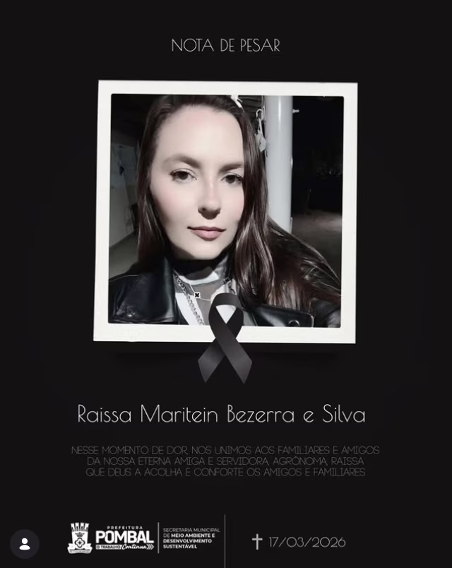 Rayssa Maritein era agrônoma e servidora pública. A prefeitura de Pombal divulgou nota de pesar em uma rede social, lamentando a morte da servidora.