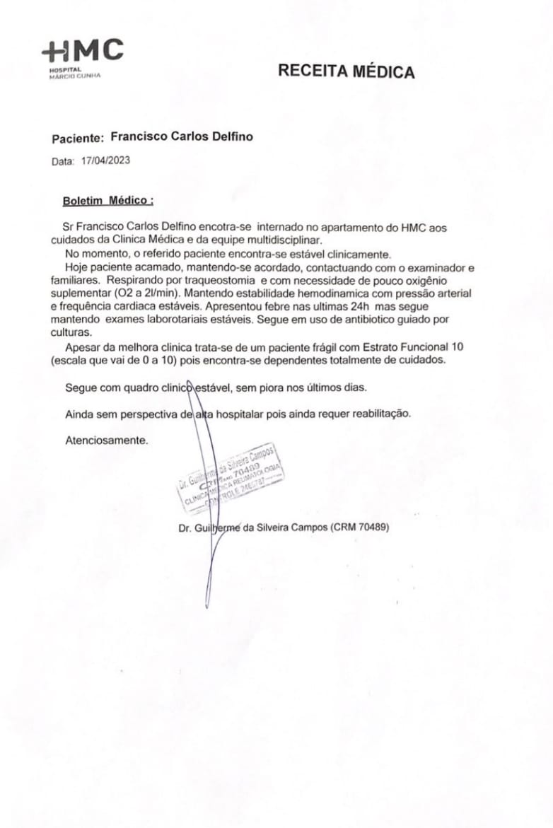 “Hoje paciente acamado, mantendo-se acordado, contactuando com o examinador e familiares. Respirando por traqueostomia e com necessidade de pouco oxigênio suplementar (O2 a 2l/min). Mantendo estabilidade hemodinâmica com pressão arterial e frequência cardíaca estáveis. Apresentou febre nas últimas 24h, mas segue mantendo exames laboratoriais estáveis. Segue em uso de antibiótico guiado por culturas. Segue quadro clínico estável, sem piora nos últimos dias”, diz parte do boletim médico.